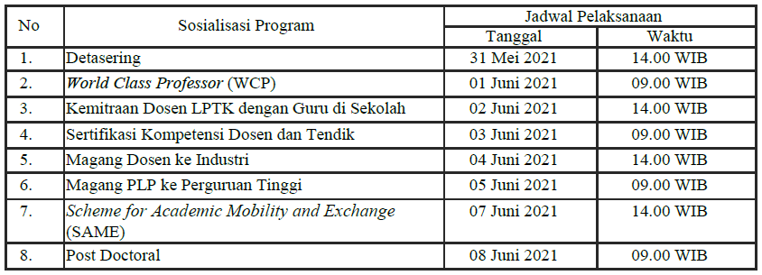Menindaklanjuti pembukaan penawaran Program Peningkatan Kompetensi Dosen dan Tenaga Kependidikan (Non-Degree Program) Tahun 2021. Direktorat Sumber Daya, Direktorat Jenderal Pendidikan Tinggi akan melaksanakan Sosialisasi terhadap masing-masing Program Peningkatan Kompetensi Dosen dan Tenaga Kependidikan di Perguruan Tinggi Akademik dengan jadwal pelaksanaan sebagai berikut: