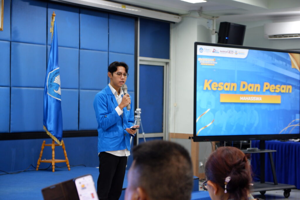 Mahasiswa Universitas Bina Sarana Informatika, Ahmad Maulana, tengah menyampaikan kesan selama mengikuti program Magang Mandiri LLDikti Wilayah III.